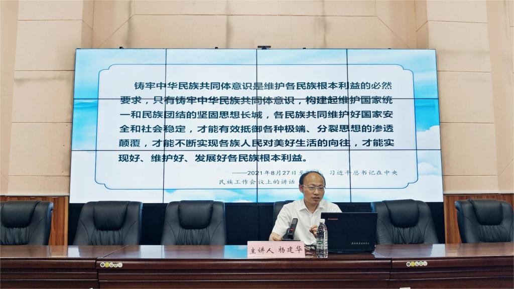 杨建华以“铸牢中华民族共同体意识”为主题,围绕“五个认同”“四个共同”“四个与共”“四对关系”深入解读铸牢中华民族共同体意识的丰富内涵,对推进中华民族共同体共有精神家园建设、推动各民族共同走向社会主义现代化、促进各民族广泛交往交流交融、提升各民族事务治理体系和治理能力现代化水平等全面阐述了铸牢中华民族共同体意识的实践路径,并结合实际详细介绍我校在推进中华民族共同体建设方面的实践经验和取得的成效。