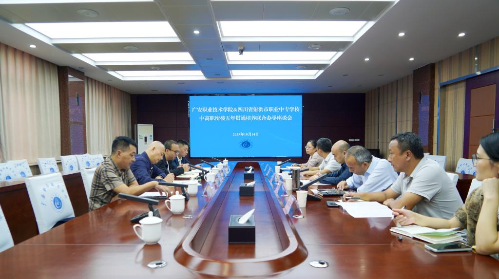 为深化中高职衔接五年贯通培养工作,积极推进现代职业教育体系建设,实现资源共享、优势互补,10月14日,四川省射洪市职业中专学校党委书记李勇一行四人到我校考察交流。学校党委委员、副校长冉嘉洛出席座谈会,招生就业处处长杨小锋、教务处处长甘华银、对外交流与合作处处长杨奇峰、新材料与化学工程学院院长唐利平参加座谈会。