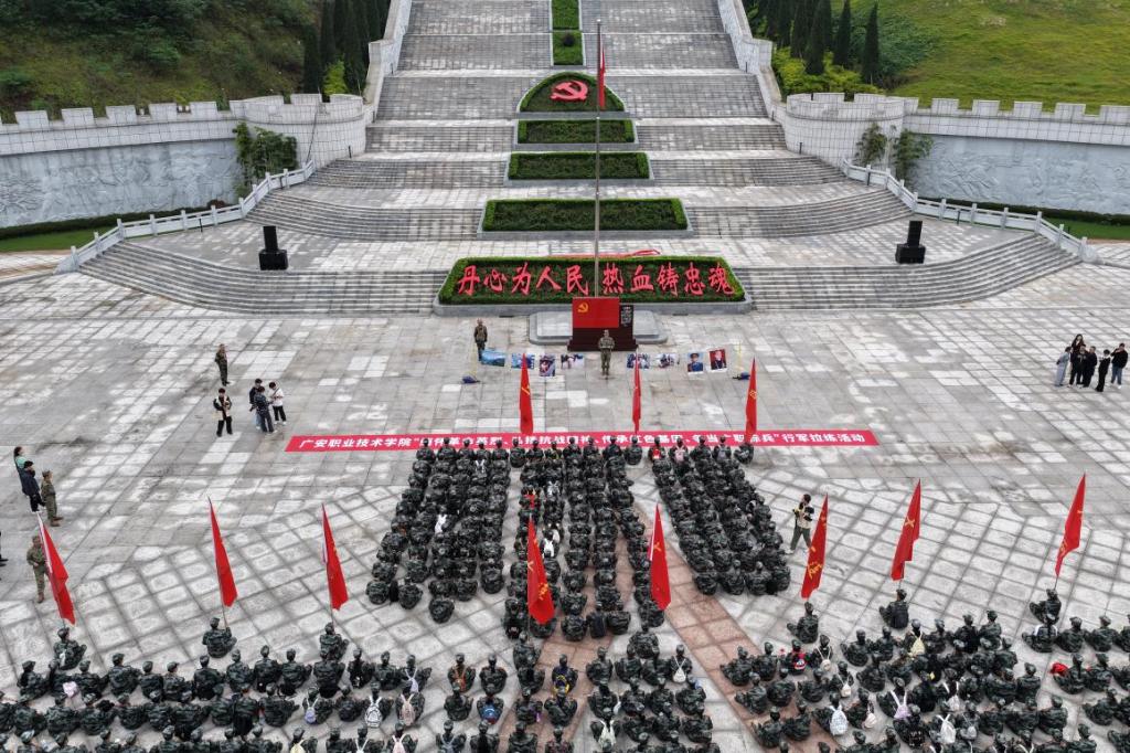 上午8时,滨江校区新生从校区北门出发,沿滨江东路、凤凰大道、广官路徒步至广安市烈士纪念陵园,全程约9公里。在庄严肃穆的烈士纪念园,全体师生举行了祭英烈仪式,包括肃立默哀、敬献花篮、听取对越自卫反击战“一等功”获得者雷泽斌同志的报告、新生代表发言等环节。