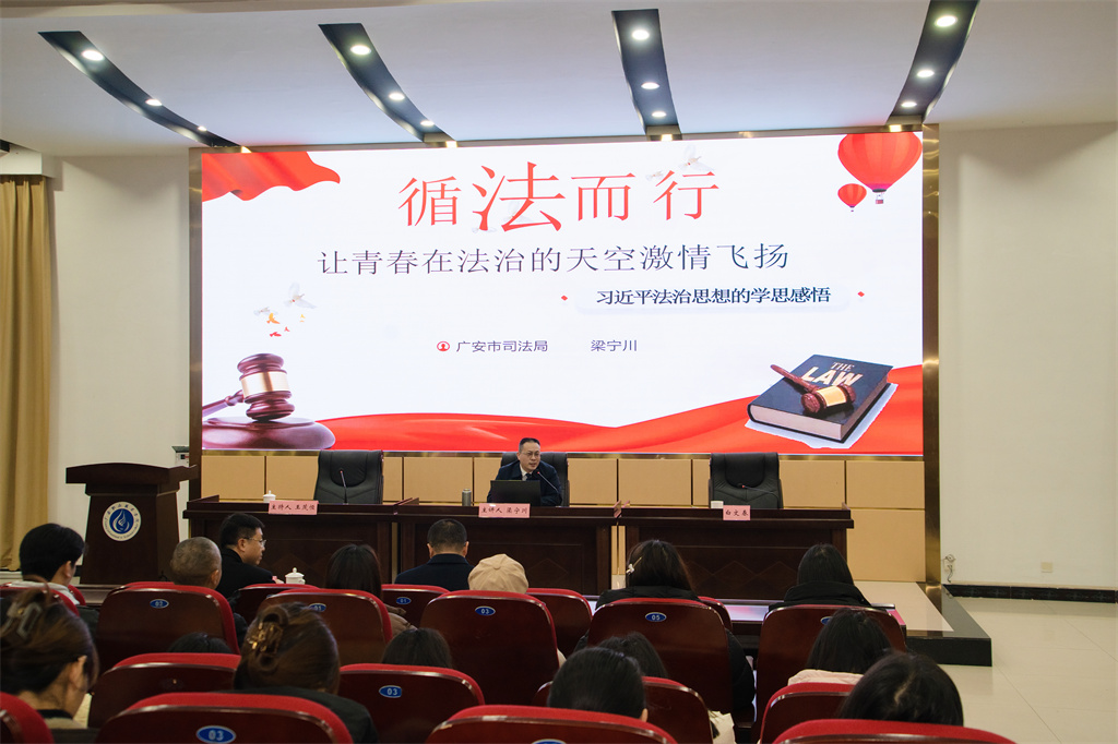 为进一步弘扬宪法精神,深植法治信仰,引领广大青年学生学思践悟习近平法治思想,12月3日,广安职业技术学院、广安市司法局联合开展“宪法法律进高校”活动。广安市司法局党组成员、副局长梁宁川为200余名师生带来了一场以“循法而行,让青春在法治的天空激情飞扬”为主题的学习贯彻习近平法治思想专题讲座。学校党委委员、组织部部长白文春致辞,并为梁宁川同志颁发了法治副校长荣誉证书。