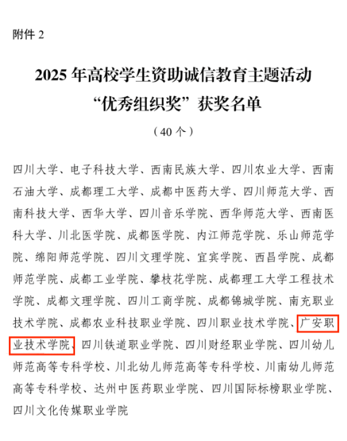荣膺此项殊荣,是对我校资助诚信教育工作成效的生动注脚。以此为契机,学校将在资助育人的沃土上深耕细作,进一步筑牢受助学子的诚信根基、培育感恩情怀、激扬励志精神,让诚信意识与责任担当深植于每一位广职学子的心中。
