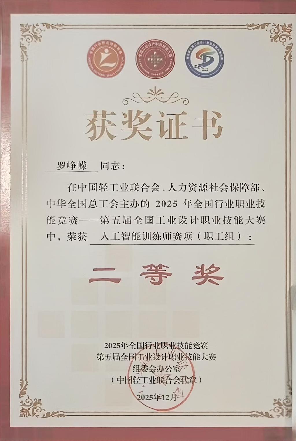 近日,第五届全国工业设计职业技能大赛全国总决赛在浙江宁波圆满落幕。广安职业技术学院电子与信息工程学院专任教师罗峥嵘在比赛中发挥出色,经过激烈角逐,最终在人工智能训练师赛项中荣获全国总决赛二等奖,展现了扎实的专业技能与优秀的职业素养。