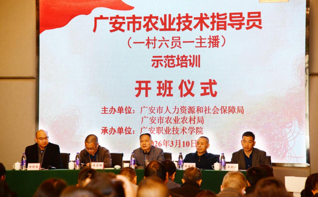 3月10日上午,广安市农业技术指导员示范培训开班仪式在锦江都城酒店报告厅隆重举行。广安市就业服务管理局四级调研员郭世建、广安市农业农村局农广校校长李育钟、广安职业技术学院党委委员、副校长袁驰出席仪式,广安职业技术学院继续教育学院院长王秋林主持。