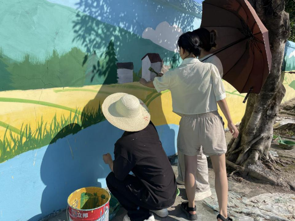 活动期间,尽管时而阴雨连绵、时而烈阳高照,同学们依然热情高涨,坚持在雨中完成调色、勾勒、上色等每一个步骤,展现了坚韧不拔的意志和对艺术创作的执着追求。此次活动历时六天,同学们充分结合长坪村的历史文化与乡村风貌,设计了一系列富有乡土气息、体现时代新风的墙绘图案,内容涵盖乡村振兴、农耕文化、乡风文明等多个主题。原本单调斑驳的墙面,在他们的精心绘制下,变成了一幅幅色彩斑斓、寓意深远的艺术画卷,赢得了村民的一致好评。