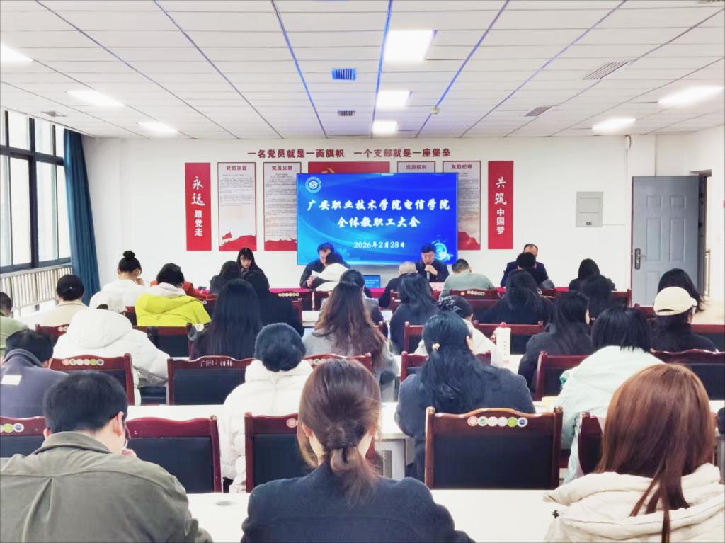 2月28日,电子与信息工程学院在学院第一党员活动室召开2026年春季教职工大会,学院全体教职工参加会议,会议由学院党总支副书记、院长王凤领主持。