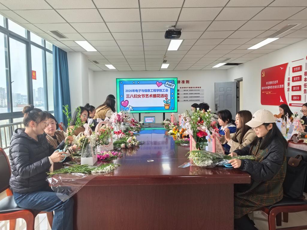为庆祝第116个“三八”国际劳动妇女节,丰富女教职工的精神文化生活,提升艺术修养与幸福感,3月6日下午,电子与信息工程学院工会在学院办公楼301室举办了“花香悦巾帼·巧手绽芳华”主题艺术插花活动。
