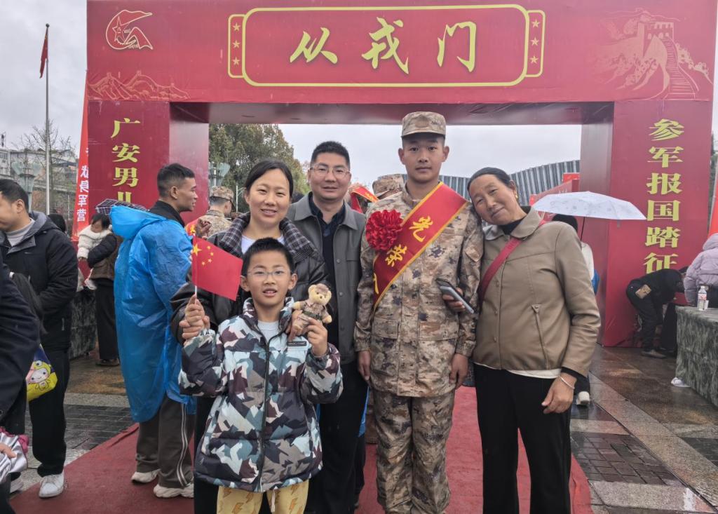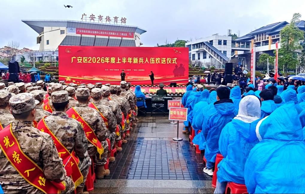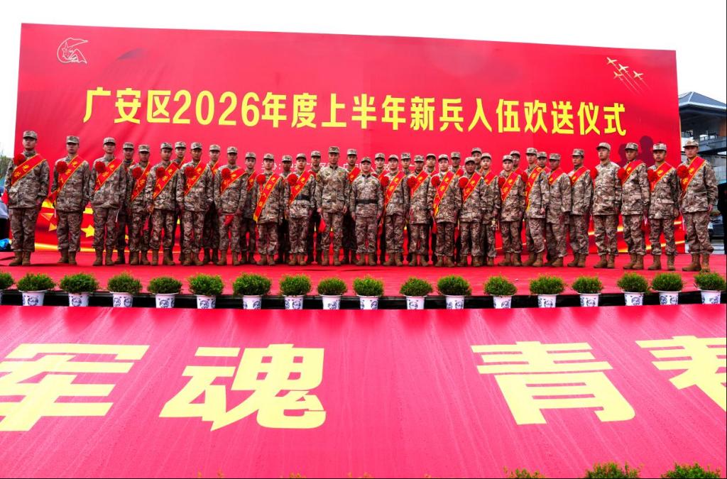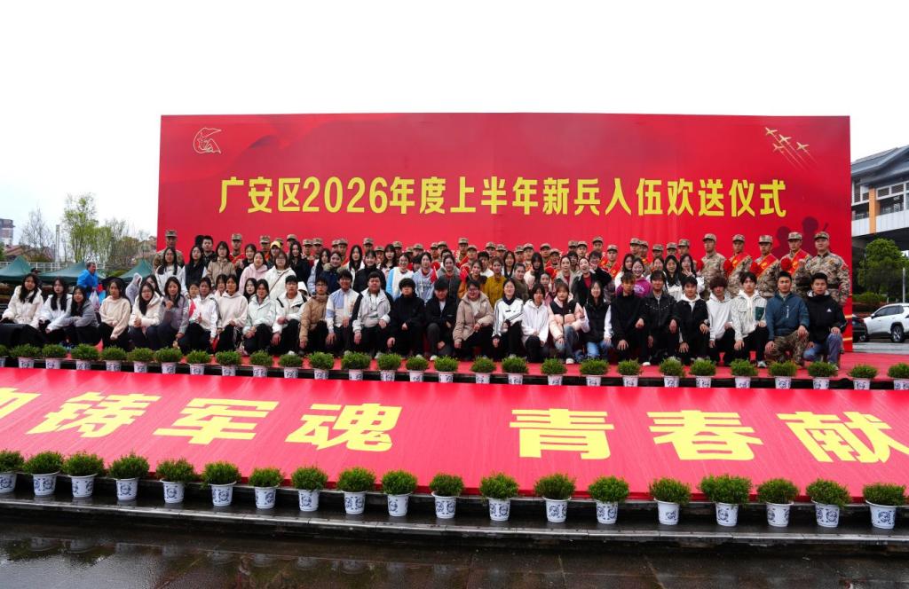 携笔从戎彰显青春本色,建功军营实现人生梦想。2026年春季,经过层层选拔考核,我校张杨、苟万里、桑郎泽仁、丹巴嘉措等36名学子从学校所在地广安区光荣应征入伍。3月15日,广安区2026年上半年新兵入伍欢送仪式在市民广场隆重举行。武装部部长李海明、干事陈平、国防先锋社50名社员以及部分学生家长共同参与,为即将踏上军旅征程的36名学子壮行送行。