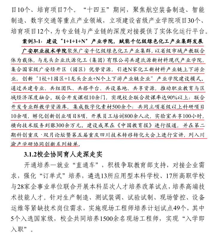近日,由四川省教育评估院编制的《四川省职业教育质量报告(2025年度)》正式发布,从全省高职院校报送的材料中共遴选出了26个案例、25个专栏。新材料与化学工程学院提交的“‘1+1+1+N’产业学院,赋能千亿级绿色化工产业集群发展”案例成功入选。
