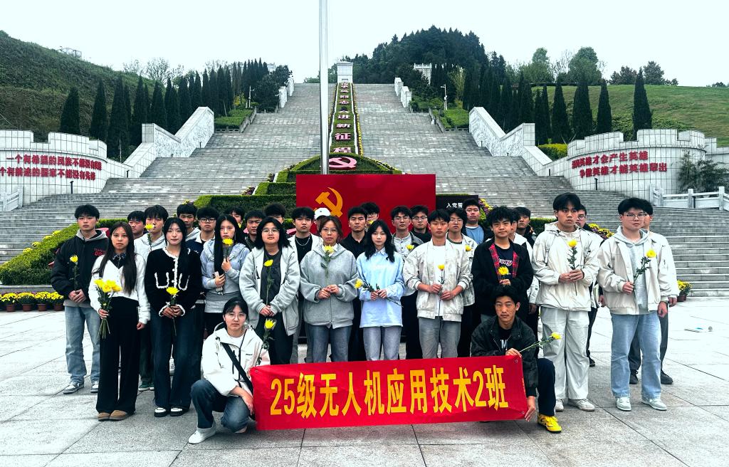 苍松翠柏掩映下的烈士陵园庄严肃穆。全体学生整齐列队,在纪念碑前依次献上小白花,并默哀三分钟,向为民族独立和人民解放英勇献身的革命先烈表达深切哀思。学生代表结合无人机应用技术专业做了学习发言,表达了继承先烈遗志、以专业技能报效祖国的坚定决心。全体同学高举右拳庄严宣誓,铿锵誓言传递出新时代青年勇担使命的信念与力量。