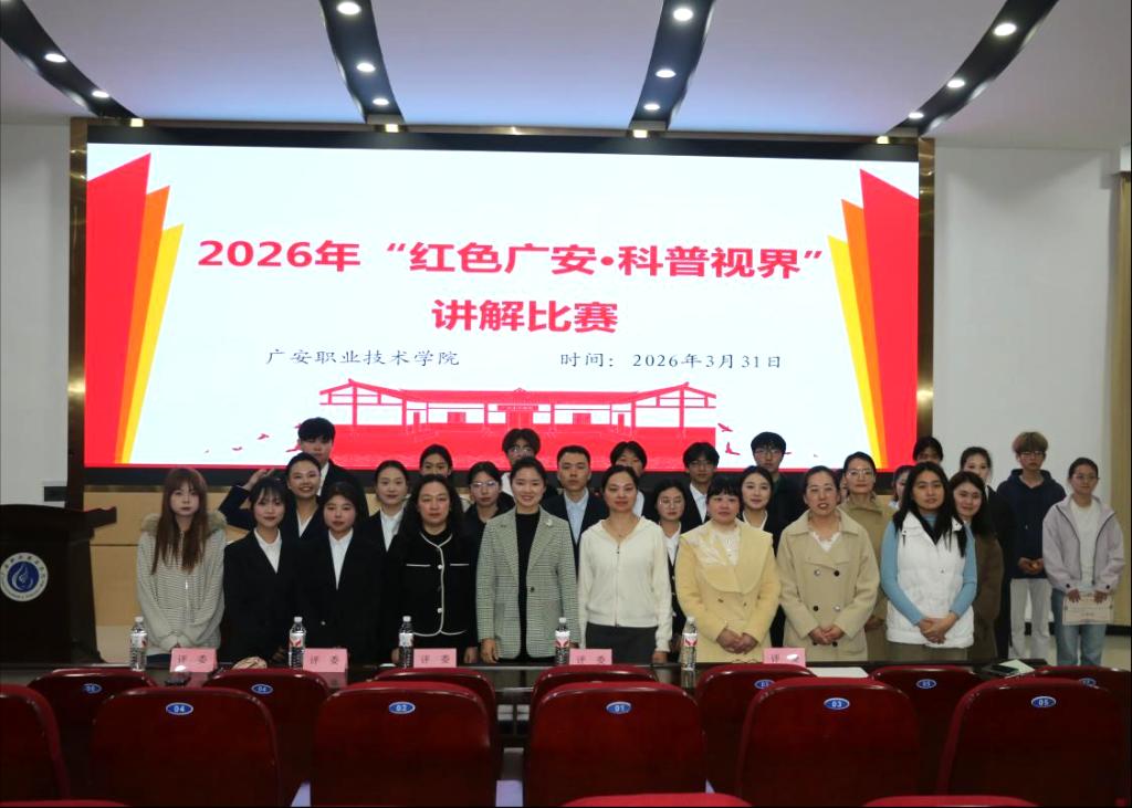 为深入贯彻习近平新时代中国特色社会主义思想,弘扬科学精神与红色文化,推动社科普及与红色旅游文化融合发展,由广安职业技术学院社会科学界联合会主办,广安红色旅游文化社科普及基地、经济与旅游管理学院红育经英辅导员工作室承办的2026年“红色广安·科普视界”讲解比赛于3月31日在学校希贤厅圆满落幕。来自各二级学院、社科普及基地的20余名师生选手同台竞技,用生动的语言和创新的形式,讲述红色故事,传播科学知识。
