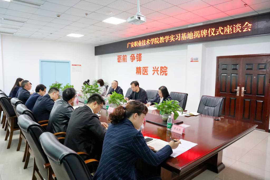 座谈会后,与会人员考察了前锋区人民医院,了解了学生实习和工作情况。罗刚与庹田共同为“广安职业技术学院教学实习基地”揭牌。